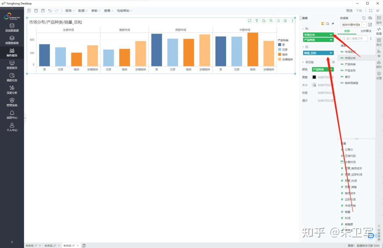 上面是分区域的咖啡种类销量柱状图,先选取柱状图组件,接着只需要把维度(市场分布、产品种类)拖到列,把度量(销量)拖到行即可完成图表制作。