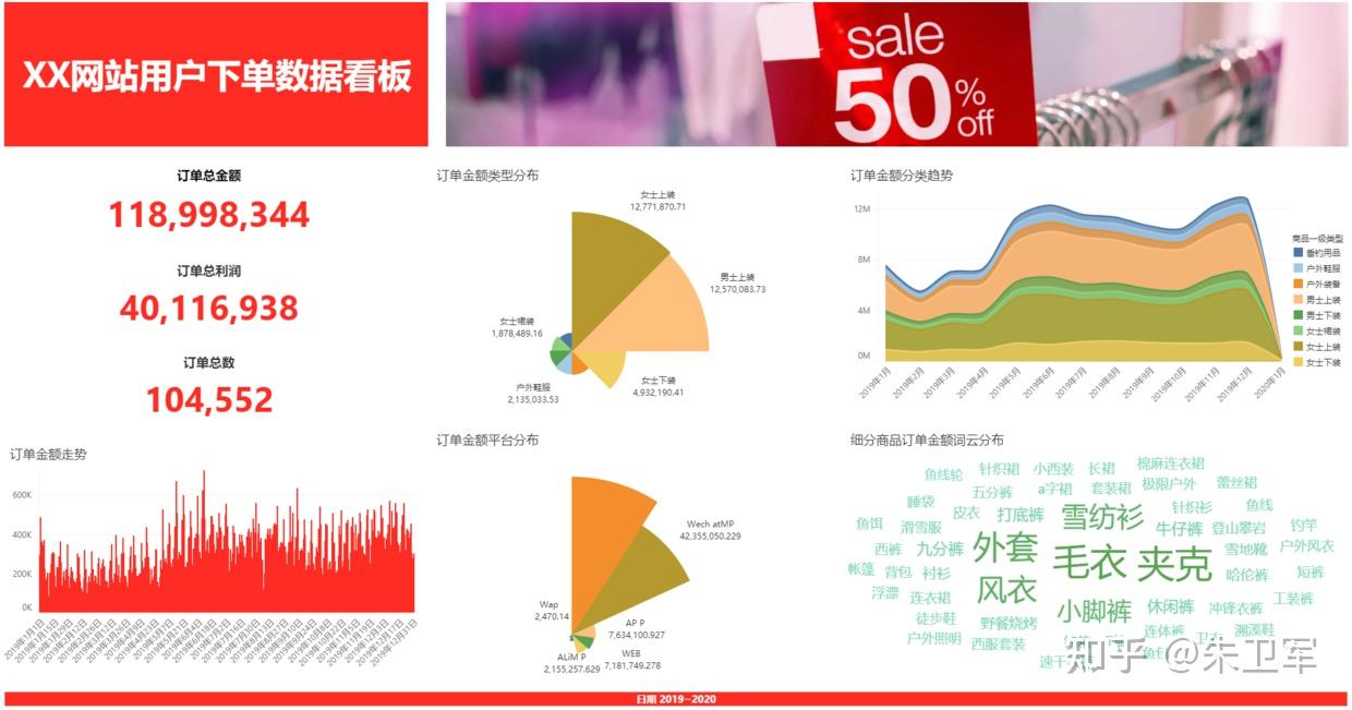 整体分布比较简单,包括标题、订单数据、订单金额走势、订单金额类型分布、订单金额平台分布等。