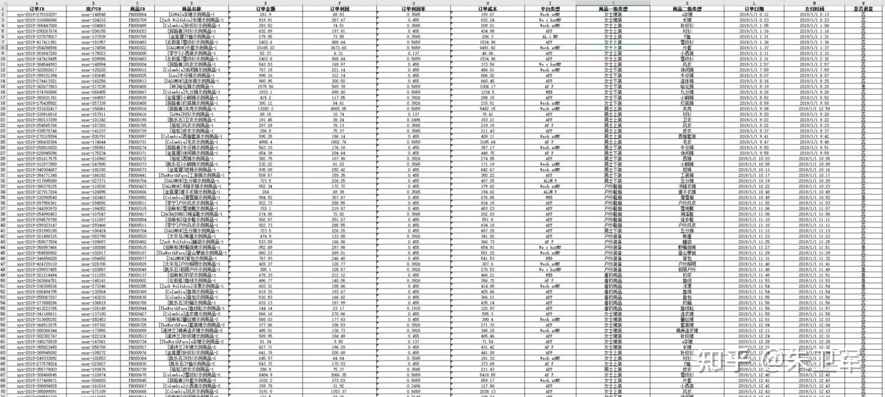 经过处理的底表数据共有14个字段,每一行代表一个订单,具体如下: