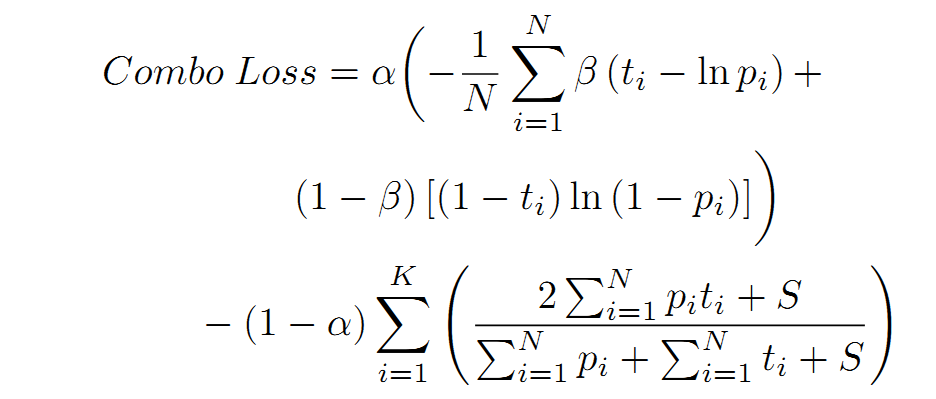 5. Taghanaki等人发现使用单独的基于重叠度的损失函数存在风险,并提出将基于重叠度的损失函数(Dice Loss)作为正则化项与加权交叉熵(WCE)结合构成新的损失函数——Combo Loss,以处理输入和输出不平衡问题,公式如下所示:
