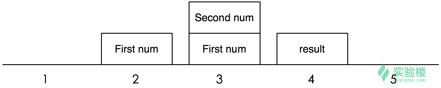 我们的解释器是一个堆栈机器,所以是使用栈来完成加法的。首先执行第一个指令 LOAD_VALUE,将第一个数压入栈中,第二个指令同样将第二个数压入栈中。第三个指令 ADD_TWO_VALUES 弹出栈中的两个数,将它们相加并将结果压入栈中,最后一个指令弹出栈中的答案并打印。栈的内容变化如下图所示:
