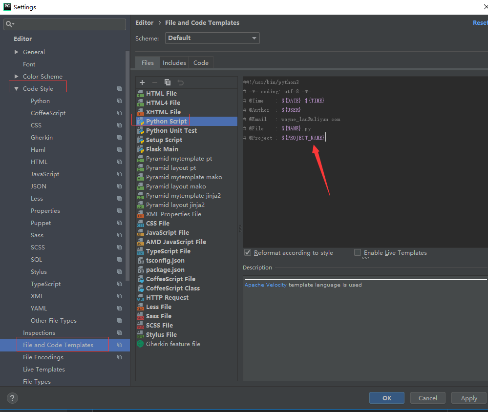 由于一些编码的原因,我们看到的python文件,通常都会在文件头写明#-*- coding:utf-8 -*- 等说明语句,当然经常也会说明脚本创建时间以及作者联系方式等信息。每一个文件这么写是很繁琐的,在pycharm中能够设置python脚本的文件模板,让文件创建的时候就自动写上以上说的一些相关信息。