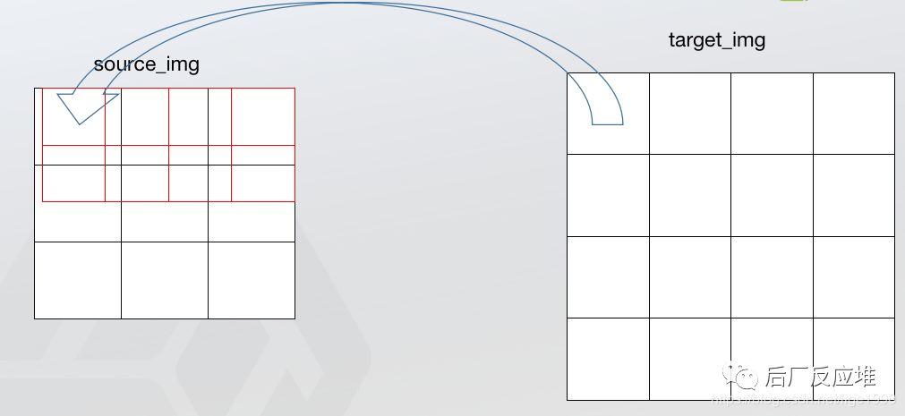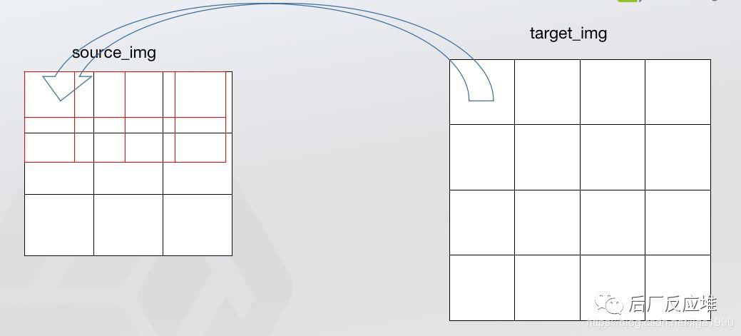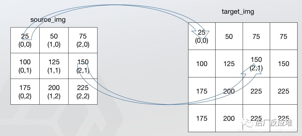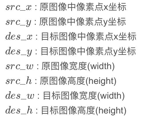 假设源图像大小为m*n,目标图像为a*b。那么两幅图像的边长比分别为:m/a和n/b。注意,通常这个比例不是整数,编程存储的时候要用浮点型。目标图像的第(i,j)个像素点(i行j列)可以通过边长比对应回源图像。其对应坐标为(i*m/a,j*n/b)。