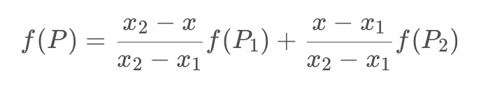 这里可能还会有点小疑问,如果根据对应关系找到原图中的点不是在不同的点之间,而是跟原图像中的点重合,那该如何找4个点?关于这个问题要看一下双线性插值的计算公式,双线性插值实际上是从2个方向一共进行了3次单线性插值,咱们先了解单线性插值的计算方式。