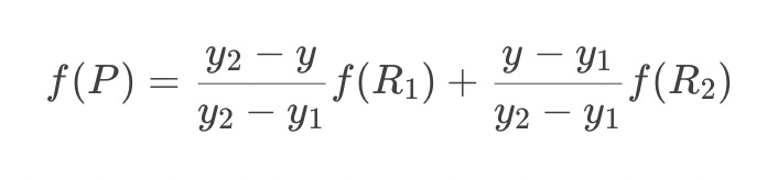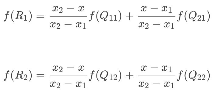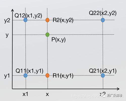前面介绍过双线性插值是分别在两个方向计算了共3次单线性插值,如图所示,先在x方向求2次单线性插值,获得R1(x, y1)、R2(x, y2)两个临时点,再在y方向计算1次单线性插值得出P(x, y)(实际上调换2次轴的方向先y后x也是一样的结果)。