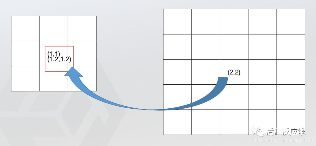 整体的图像相对位置会发生变化看下面这张图,左侧是原图像(33),右侧是目标图像(55),原图像的几何中心点是(1, 1),目标图像的几何中心点是(2, 2),根据对应关系,目标图像的几何中心点对应的原图像的位置是(1.2, 1.2),如图所示,那么问题来了,目标图像的原点(0, 0)点和原始图像的原点是重合的,但是目标图像的几何中心点相对于原始图像的几何中心点偏右下,那么整体图像的位置会发生偏移,为什么这样说,其实图像是由1个个的像素点组成,单纯说1个像素点是没有太大的意义的,1个像素点跟相邻像素点的值的渐变或者突变形成图像颜色的渐变或者边界,所以参与计算的点相对都往右下偏移会产生相对的位置信息损失。这是第二个问题。