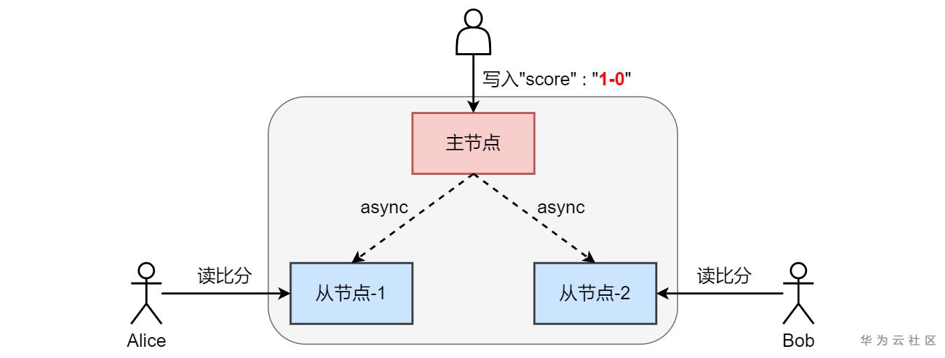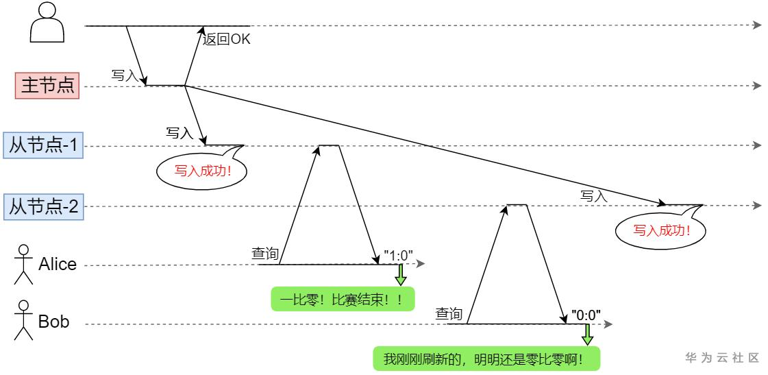 异步复制时,主节点不等待从节点写入就直接返回了。由于网络延迟等原因,从节点无法保证更新时间。Alice和Bob明明在同时同地查询同一系统,得到正确结果却有先有后。其实这就是典型的弱一致性。