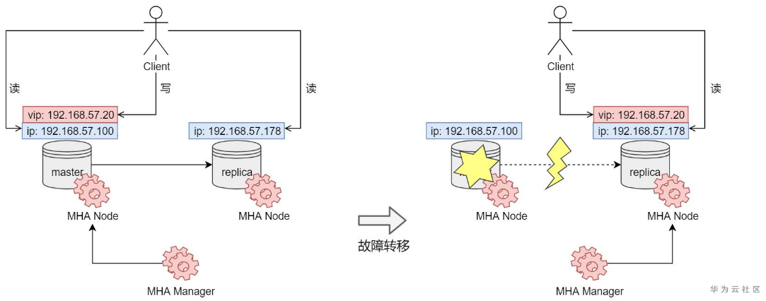 MHA负责在故障转移过程中,帮助从库尽量追平主库最新状态,提供近似一致的数据。但这一能力需要额外的Manager节点,同时还要在每一个MySQL节点上部署Node服务。故障切换时,Manager先为从库补充落后的数据,再通过切换VIP恢复用户访问,过程可能长达数十秒。