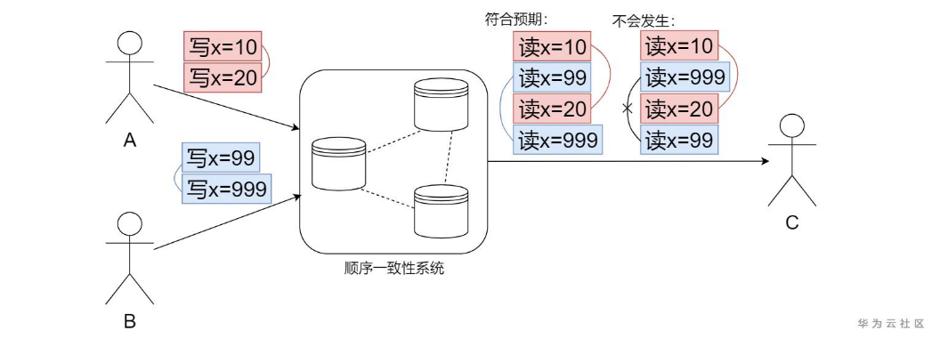 顺序一致性弱于线性一致,不保证操作的全局时序,但保证每个客户端操作能按顺序被执行。下图中,A先写x=10,后写x=20;B先写x=99,后写x=999。当C读取时,顺序一致性保证了10先于20被读到、99先于999被读到。