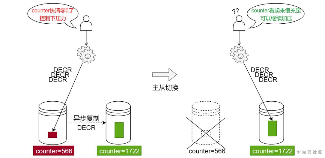 开源Redis采用异步复制,如遇网络不畅,经常发生主节点复制buffer堆积。这将导致从节点counter偏大很多。此时,一旦主节点宕机,切换到从节点继续执行DECR命令,压力很容易超出阈值,全部落到下层脆弱的MySQL,随时可能引起系统雪崩!