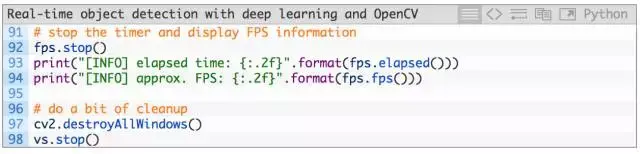 当我们跳出(exit)循环,fps 计数器 停止(第 92 行),每秒帧数的信息向终端输出(第 93、94 行)。