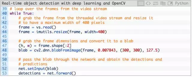 首先,我们从视频流中读取一帧(第 43 行),随后调整它的大小(第 44 行)。由于我们随后会需要宽度和高度,所以我们在第 47 行上进行抓取。随后将 frame 转换为一个有 dnn 模块的 blob(第 48 行)。