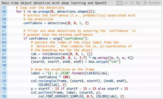 在 detections 内循环,首先我们提取 confidence 值(第 59 行)。