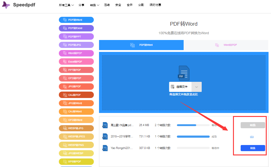 在线转换相对比较简单,我们搜索speedpdf找到并打开这个在线转换工具后,选择PDF转Word进入转换(每天还有免费转换次数可以使用哦),点击选择文件并添加需要转换的PDF文件后,点击转换就可以开始转换了,完成后直接下载即可。