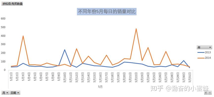 从图中可以看出2014年在5月3日,5月12日,5月22日都有明显的波动,特别是在5月22日,核证后,5月1日-5月3日(劳动节)、5月11日(母亲节)及5月20日(表白节)淘宝天猫均做促销;13年5月数据在5月3号,5月10号和5月20号也都有所上涨,说明受到节日促销的可能性很大。