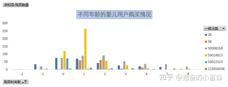 这边计算的是购买商品时婴儿的年龄,根据购买时间-出生时间,但是中间会存在负值的现象,是因为有一些用品是在宝宝出生前提前购买好的,这里的年龄是四舍五入取整的,0岁代表了一部分即将出生的婴儿和刚出生不久的婴儿,另外婴儿用品,一般作为家长的喜欢囤,所以这个只是估算婴儿的年龄来做的分析。