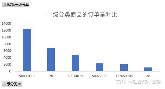 从图中可以看出 68结尾的商品,订单量是最大的,但是销量低于28产品,按照我们对于热销产品的定义,50008168为热销产品,这是商品一级分类,接下来分析该商品类下的二级分类订单量情况。