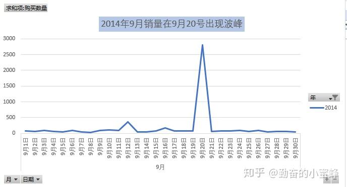 2014年在9月20号达到一个很大的波峰,2012年和2013年也有不同程度的波峰,考虑到每年的9月都会有中秋的节日,可能会不定期搞促销活动,但是9月20日并没有什么节假日或者活动日,经核查,有一笔订单,一次性订购了2748件,属于偶然事件,不作为分析范围。