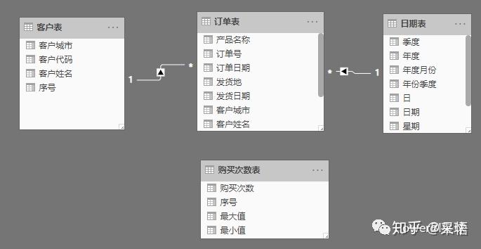 根据订单表提取出客户表,以及建立一个涵盖所有订单日期的日期表,分别与订单表建立一对多的关系。
