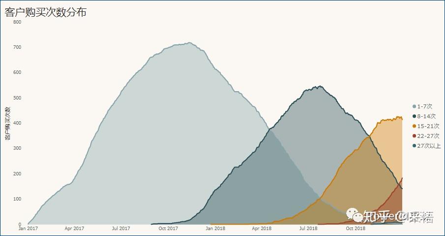 通过这个面积图,可以明显看出随着时间的推移,客户的复购次数越来越多。
