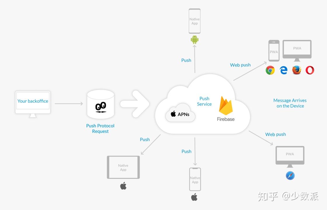 无论是 iOS 还是 Android 平台,Apple 和 Google 都为自家系统准备了专门的消息推送服务。苹果的推送服务叫 APNs(Apple Push Notification service),Google 的过去叫 GCM(Google Cloud Message for Android),现在叫 FCM,名称不同,但两者的作用大同小异:将开发者想推送的消息精确推送给终端用户。