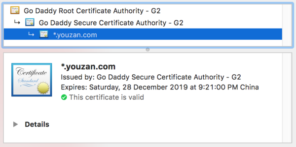证书「*.http://youzan.com」的 Issuer 就是它的父节点「Go Daddy Secure Certificate Authority」。因为 UA(浏览器或操作系统)中会预先内置一些权威 CA 签发的根证书(Root Certificate)或中间证书(Intermediate Certificate),例如上面的 「Go Daddy Secure Certificate Authority」和 「Go Daddy Root Certificate Authority」。