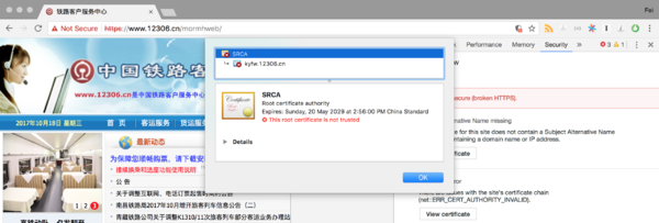 当获得证书链之后,我们就可以很轻松的往上回溯到被 UA 信任的证书,虽然 UA 内置的可能是中间证书(Intermediate Certificate),但是如果一个 End-Entity 证书即使回溯到跟证书(Root Certificate)也没有在 UA 的受信列表中找到,那么这个站点就会被标记为不安全,例如 12306 的主页被标记为 “Not Secure",因为它的根证书不被信任。