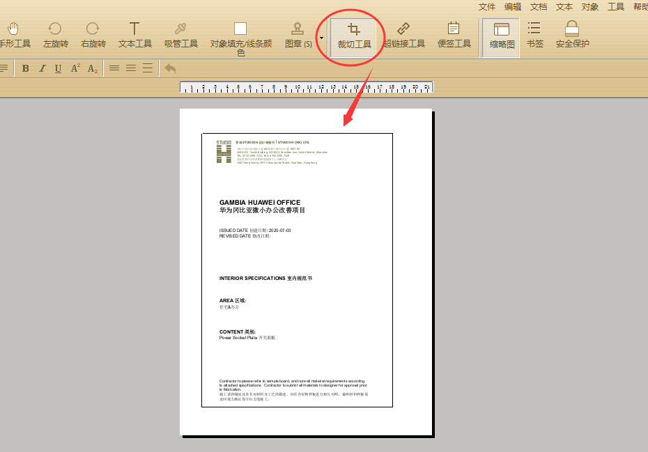 接着选择菜单栏中的“裁切工具”并在PDF其中一页中按住鼠标左键框选处需要保留的部分并双击左键确定。