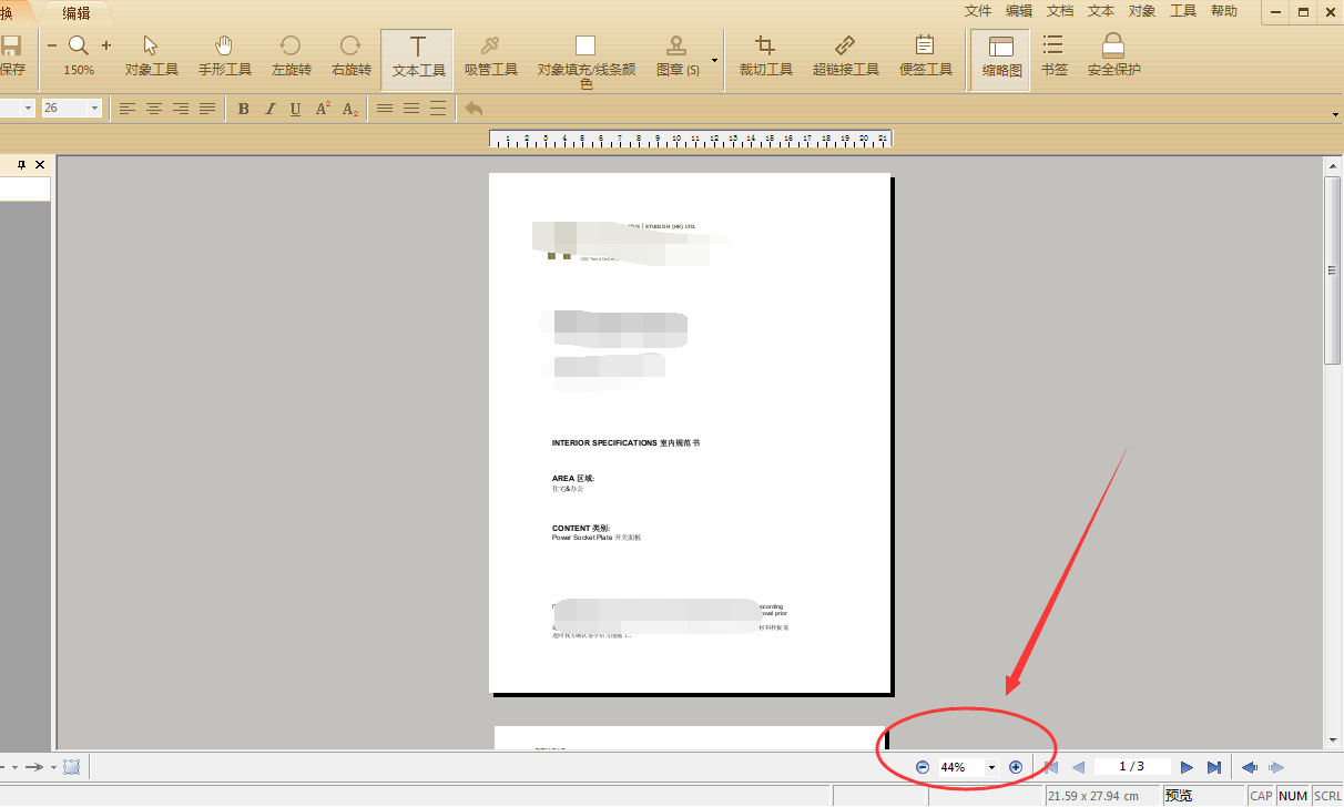 在裁切之前我们可以先通过软件右下角的页面比例缩放将页面调整到合适的大小,便于下一步整体页面的调整。
