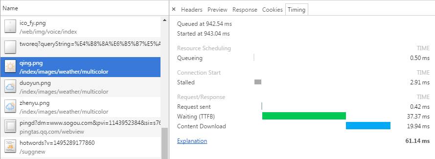 Timing是单个请求的详细时间,如果你的页面有性能问题,你可以查看每个元素的时间。