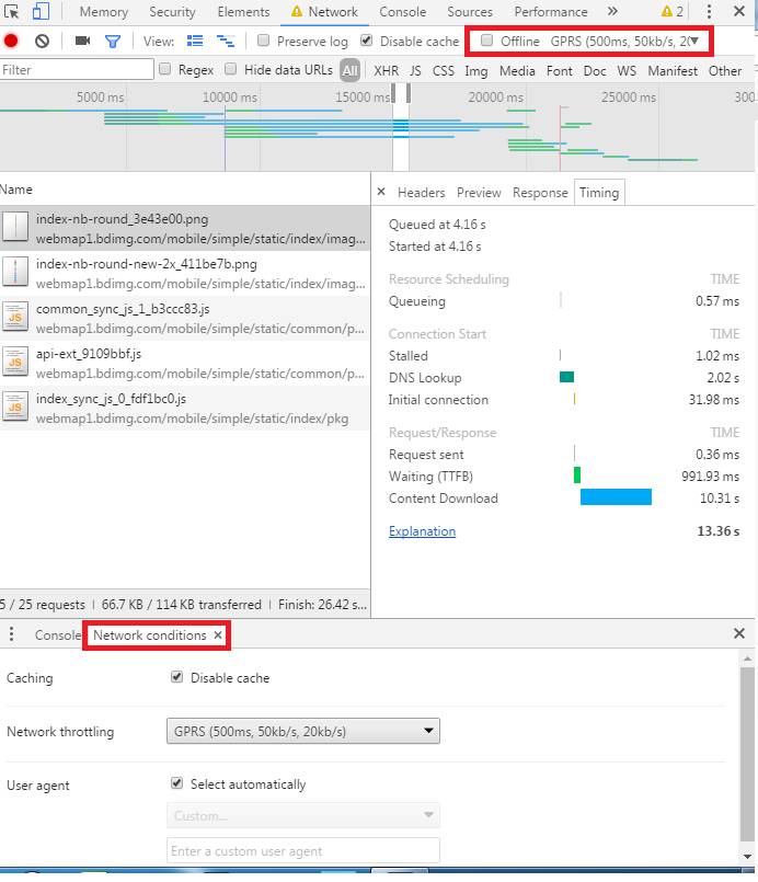B:有两个路径开启网络限速,Network中,选择throttling或者在More Tool中,打开Network Condition并选择你的Network throttling:
