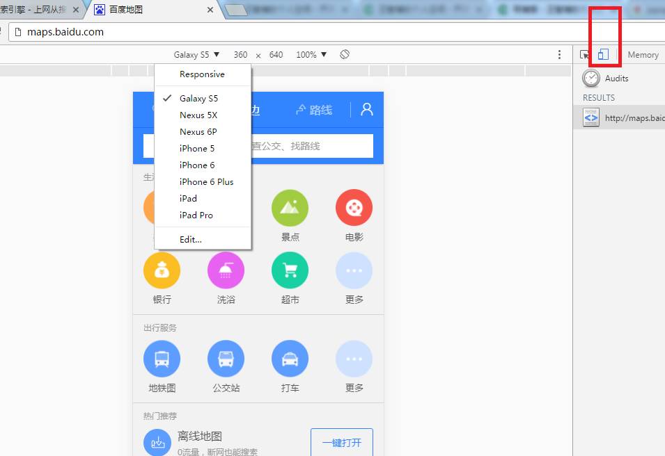 手机图标:选择之后,会以手机的UA(UserAgent)以及手机屏幕尺寸去模拟访问网页;