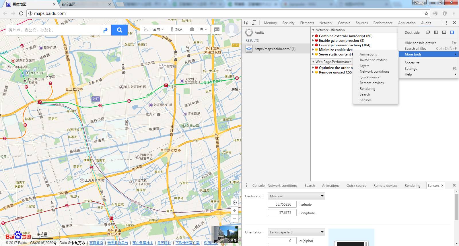 More Tool:包含JS性能分析、页面分层、自定义终端设备UA、模拟传感器等功能。