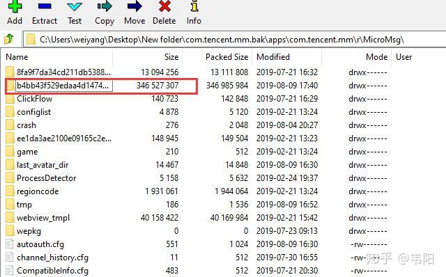 3.然后用任意一种压缩包软件(我用的是7zip)打开这个com.tencent.mm.bak文件,并且将apps\com.tencent.mm\r\MicroMsg\systemInfo.cfg、apps\com.tencent.mm\r\MicroMsg\CompatibleInfo.cfg和apps\com.tencent.mm\r\MicroMsg\xxxx\EnMicroMsg.db三个文件解压到电脑上。这里xxxx是一串随机的字母,代表你的微信用户,每个人不一样,一般是最大的那个文件夹,我这里是下图所示文件夹: