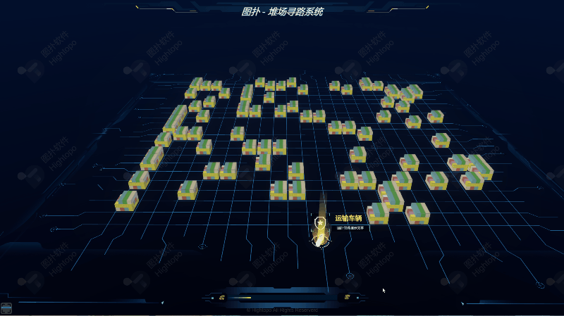 集装箱堆场就像迷宫,要让集卡准确到达指定位置并非易事。Hightopo 实现了一套寻路算法,在复杂多变的港口环境中,只需输入起点终点,便能快速规划出路线,对于车辆管控提供了便利。