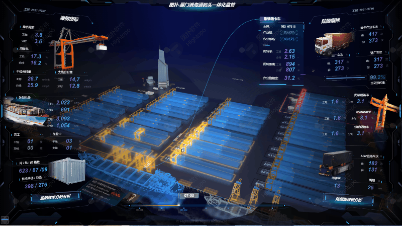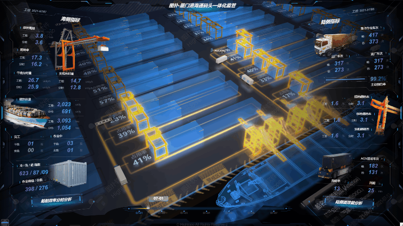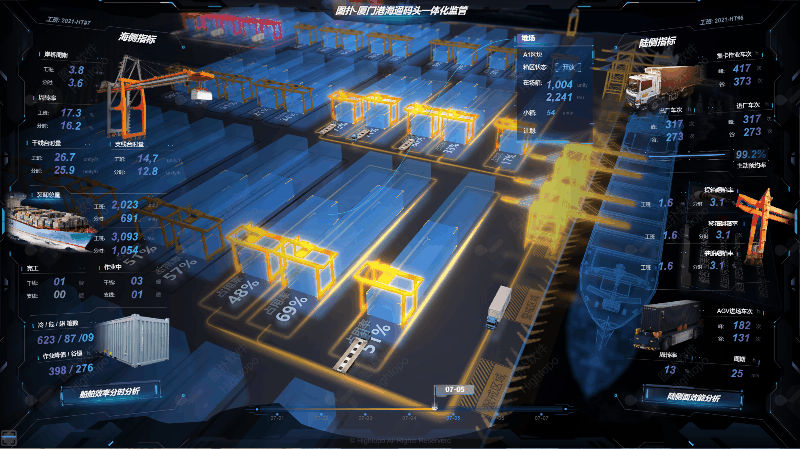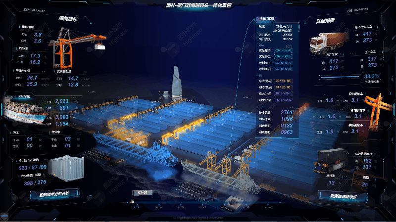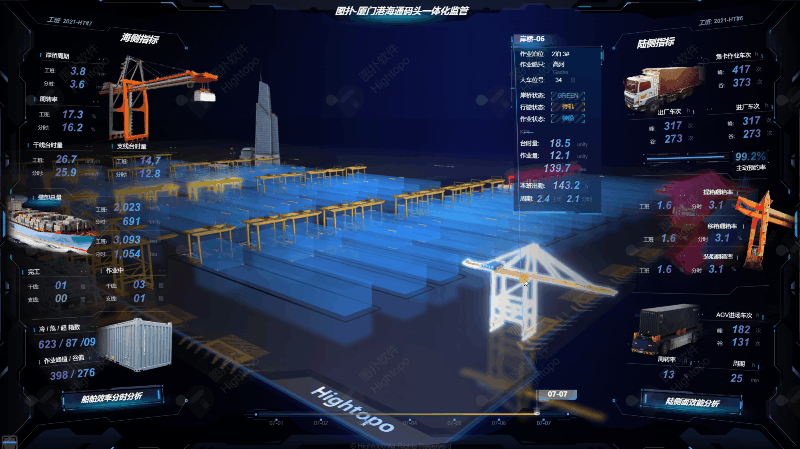 港口每天有数十条船完成停靠、数百辆集卡在港区内不停地穿梭、数万集装箱完成装卸,这些操作都需要港口计划员来制订计划,依靠人脑去规划每天的作业。如果结合 Hightopo 的可视化技术,能进一步提高调度和计划的智能化程度。