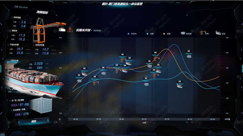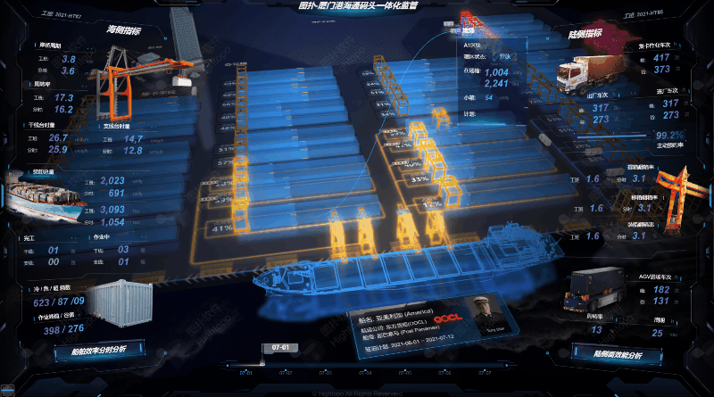 自动化港口和船舶依托新基建和新科技势能,积极抢抓数字化转型先机,把数据作为企业的核心资源,运用 Hightopo 自主研发的 HT for Web 可视化产品,擦亮绿色发展底色,解决传统码头和船舶能耗高、成本高、污染大等问题。