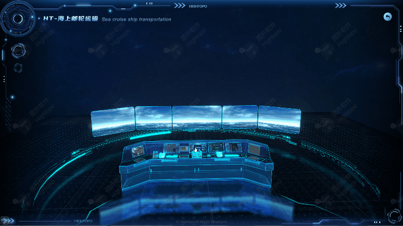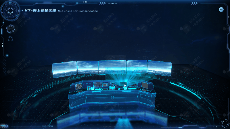 中控室综合展示区可查看船舱监控,海上气象情况,发动机数据监测,船体转向查看,坐标定位。综合展示区从船上和陆地上的各种来源收集信息,并在显示器上展示出来。船长和轮机长可以通过查看显示器上的信息来检查船舶的运行状况并制定航线计划,控制船舶。