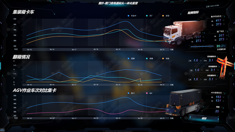 实际生产过程中,经常会遇到某条船的作业进度落后计划的情况,这时就需要增加集卡资源,提高作业效率,确保船舶按时完工离泊,但是增加多少集卡目前往往凭借主观判断,没有科学的依据做指导,因此经常会造成集卡投入过多,船舶提早完工,等待离泊时间很长,造成集卡和泊位资源的巨大浪费。运用 Hightopo 自主研发的 HT for Web 可视化产品,将集卡和AGV 车次接入实时数据,管理者可进行综合分析,有效减少浪费。