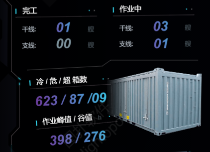 货轮运输与 HT 可视化系统相结合,能准确显示靠泊时间、实际开工时间、计划完工时间、计划离泊时间、总冷/危/超、剩冷/危/超、总大小箱、剩大/小箱、作业总量、剩余作业、剩余装船、剩余卸船,通过数据驱动实现对船只装卸总量(完工、作业中)的统计,分析船舶作业效率,为合理安排工班、调配资源提供科学依据。