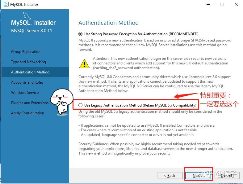 所以这里一定要选第二个(下图红框的地方),因为我们后面使用mysql客户端navicat版本是9.X,它链接mysql用的是就是这个加密算法,所以这一步很重要。(重要的事情说三遍)