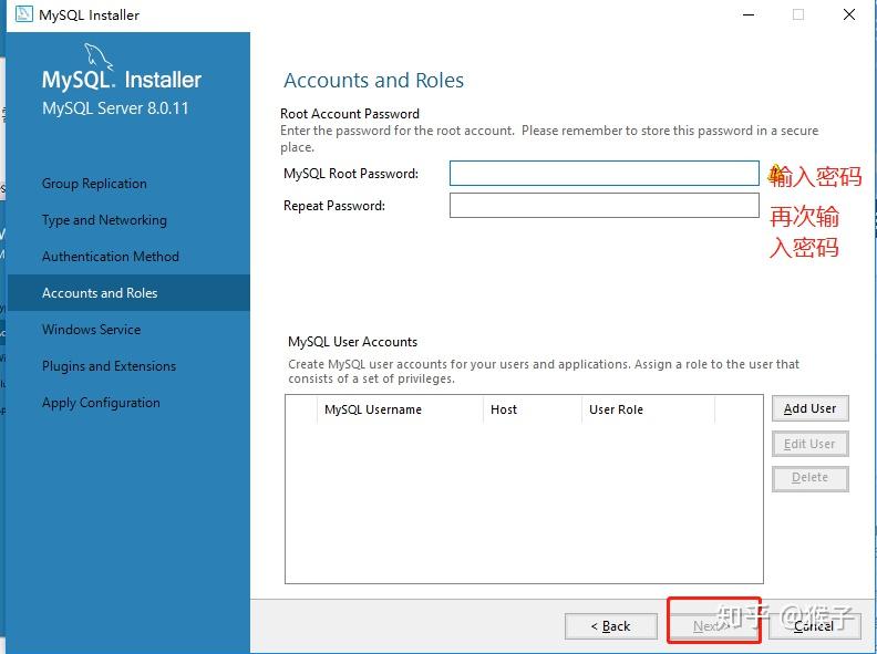 11.设置密码,需要牢记,最好将登陆用户名(是root)和密码(下图的地方设置)记录到其他地方,因为后面要用这个密码连接数据库。