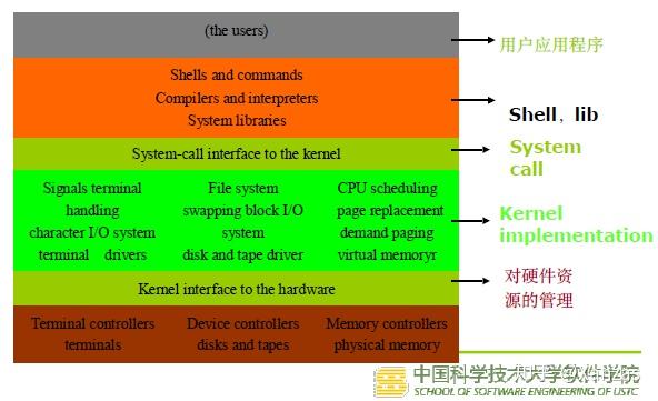 操作系统:内核(进城管理、进程调度、进程间通讯机制、内存管理、中断异常处理、文件系统、I/O系统、网络部分)+其他程序(库函数、shell程序、系统程序等)