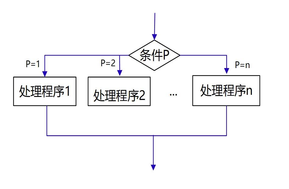 多元选择结构,为二元选择结构的一个变体,从多个程序中选择一个符合条件的继续执行。流程依据某些条件,分别进行不同处理程序。