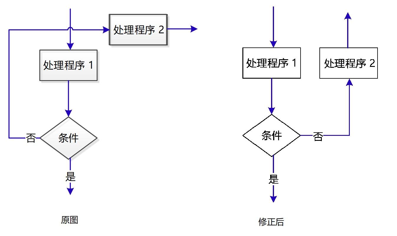 图二则很容易形成误解,条件一的判断逻辑被忽略,因为没有明确的指向节点。流程图的每一个条件判断和命令执行,都必须指向明确的节点。处理程序的基本原则是依处理逻辑顺序执行,每一个符号都必须有完整的逻辑关系,必须保证不出现任何悬而未决状况。