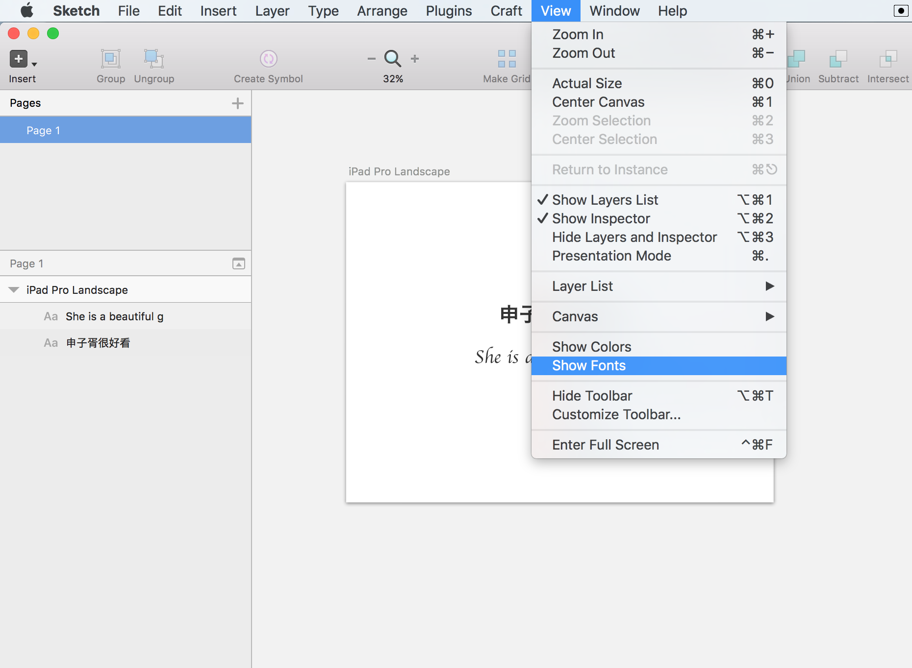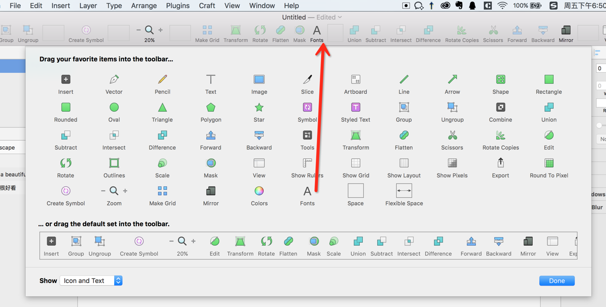 工具栏里「View」→「Show Fonts」,可以打开字体面板。