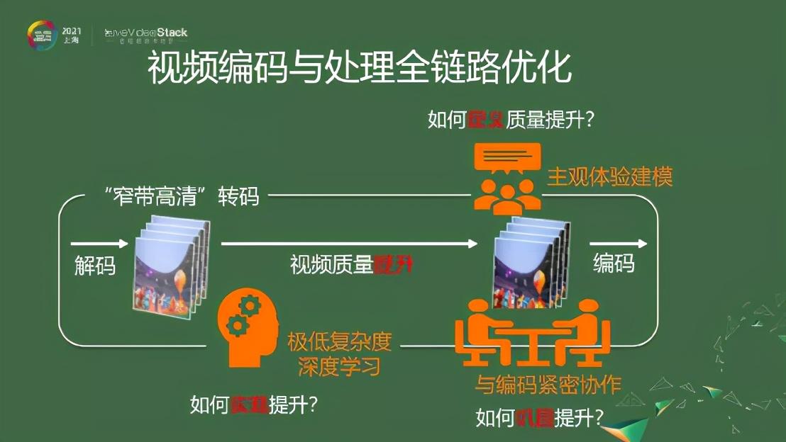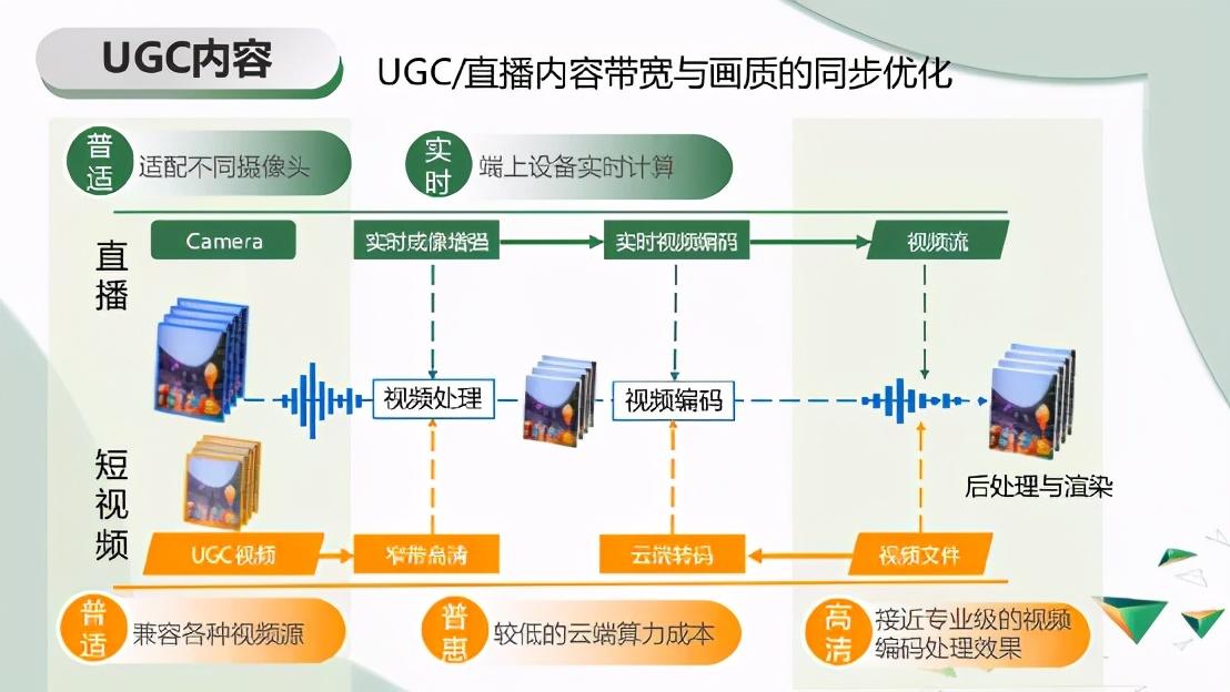 前面提到,无论是UGC的视频,还是很多直播的视频,他们的质量是参差不齐的。比如我们做村播的时候,在农村的这些主播,他的水果或蔬菜给人看到的是不够清晰的。所以我们需要去把这项内容做得更好,我们既需要去降低带宽又需要同步去提升他的画质。我们主要是通过把视频处理,包括视频编码联合做好,来达到这样的效果。