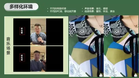 从内容角度来讲,包括声音场景和视觉场景,其实也要做很多场景自适应的算法。比如音乐场景,主播在卖一些音乐器材和音响设备。不针对场景进行优化的话,我们尝试听一下声音,可以发现一些音乐的呈现是不太清楚的,针对场景进行优化之后对音乐的表达就会更加清楚。