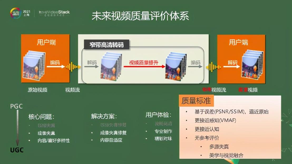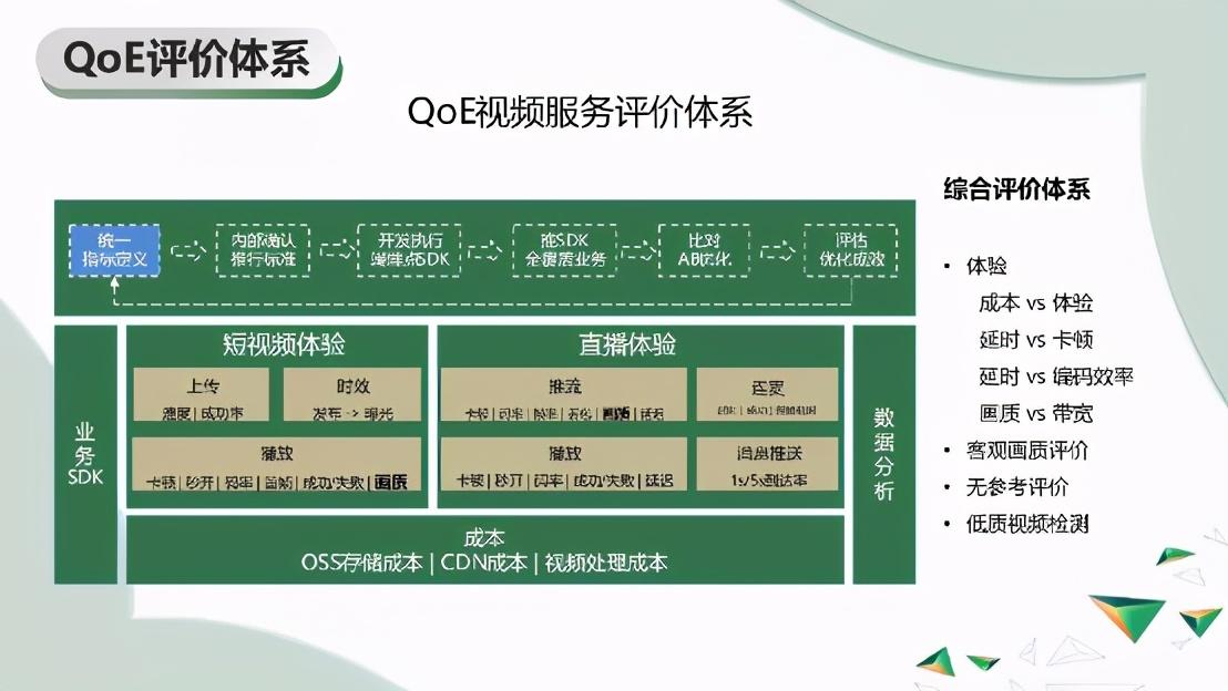 提到QoE评价体系,很重要一点其实是画质。我们会发现,之前PSNR/SSIM尽量把误差做得比较小,逼近原始,而VMAF更加靠近感知。其实之前也说了,不同场景不一样也要做到精彩对味实际上是要更加接近我们的认知的。很多场景下面我们要大量地用无参考的评价,这种情况下要处理多元化的失真,甚至要考虑美学与视觉的结合。按照这样的方向,我们也建立了初步的质量评价体系,也会根据业务的需要持续迭代升级我们的画质评测标准。质量评价体系这块我们也在加大投入,希望能做得更好。