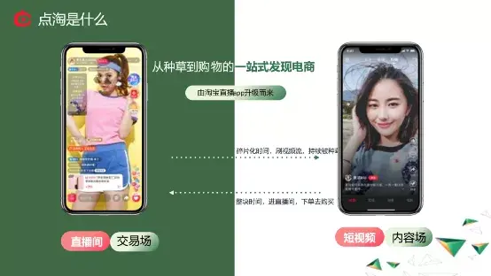 大家可以看到淘宝直播是在整个淘宝大的APP里面的,本身得到淘宝APP的加持,但也有一定的限制。因此我们从淘宝直播系统里衍生出了新的独立的APP「点淘」,它既包含所有淘宝直播的内容,也包含短视频的内容。